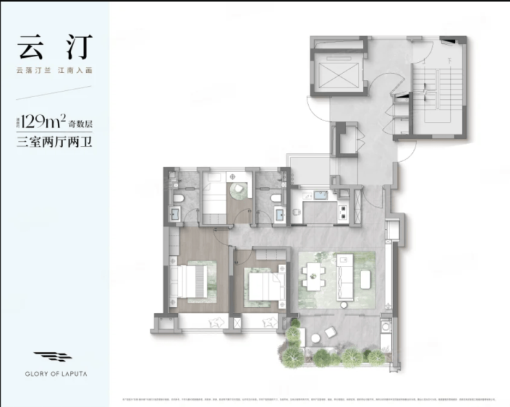 129㎡ 云汀 | 三室两厅两卫:奇数层得房率约94%,偶数层约95%,空间利用率高