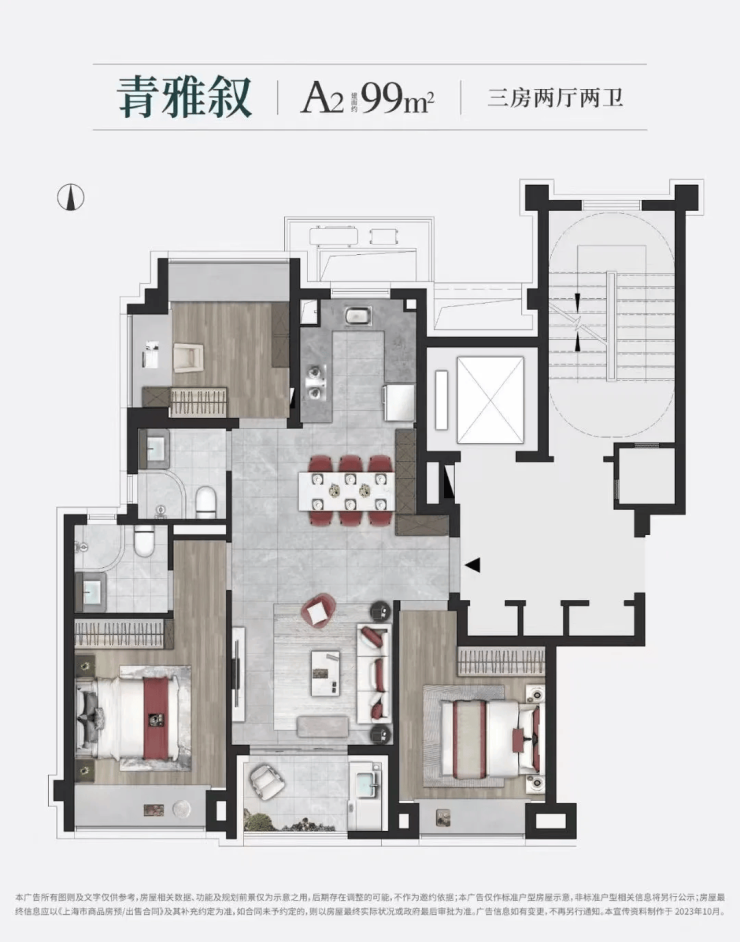 空间设计 : 99㎡户型得房率超80% , 无浪费过道,客厅通透,厨房可做中西双厨 。