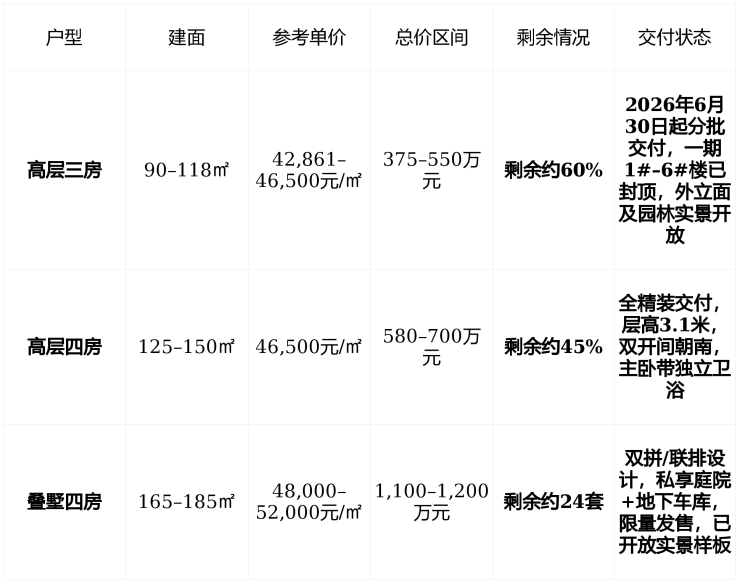 💰 在售情况:主力户型90–185㎡,均价4.6万/㎡,2026年6月起分批交付,配套实景已兑现