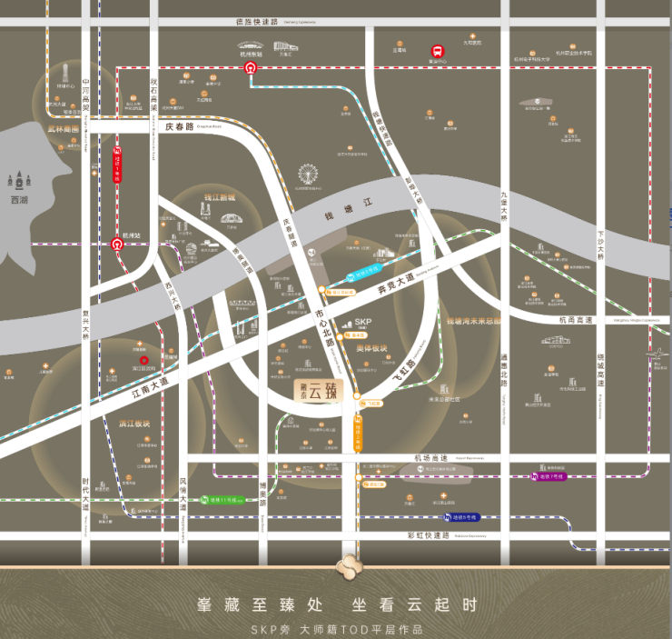融泰云臻(推广名:融泰云臻铭座)位于杭州钱江世纪城奥体板块核芯区(市心北路与飞虹路交汇处)[[1][2],与钱江新城并称“杭州CBD双核”。项目由浙江新世界房地产集团开发,定位为“国际艺术奢居”,总建筑面积约50万㎡,规划仅61席限量房源,主力户型410-420㎡大平层,总价1500万起[[1]。作为地铁2号线飞虹路站上盖TOD,无缝串联SKP商圈(直线900米)、奥体印象城等顶奢配套[[1][3]。
