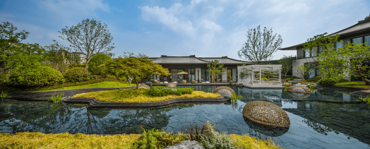 项目打造约4万方新中式园林,仿照江南名园寄畅园设计,包含梯田叠水、中央草坪等景观