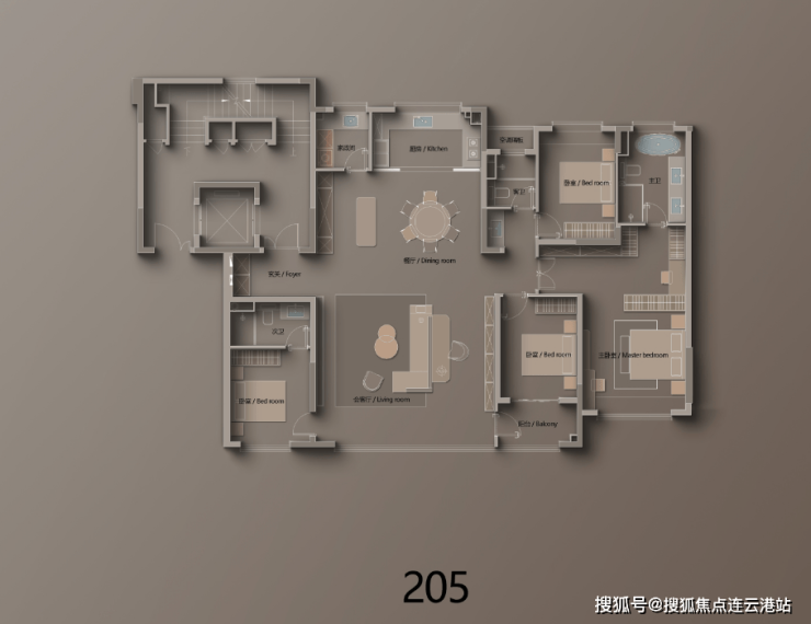 四房两厅三卫户型,三卧室朝南+南向双套房,私密性与舒适感兼具,星级酒店式主卧套房尺度感拉满。