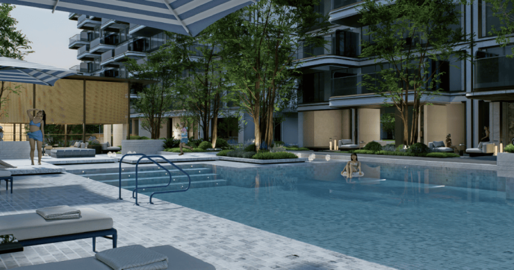 全域抬高设计从根源上重构居住与城市的距离,整体抬高的建筑基底,让住宅首层告别传统地面的潮湿、噪音与隐私隐忧,一定程度隔绝城市主干道的车流声、地面人群的喧嚣。