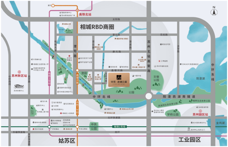 周边中环北线春申湖快速路、苏州北站高架路环绕,自驾10分钟可达高铁新城,15分钟抵达苏州中心。