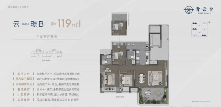空中庭院:偶数层户型客厅联通19-25㎡空中庭院,7.2米北向阳台