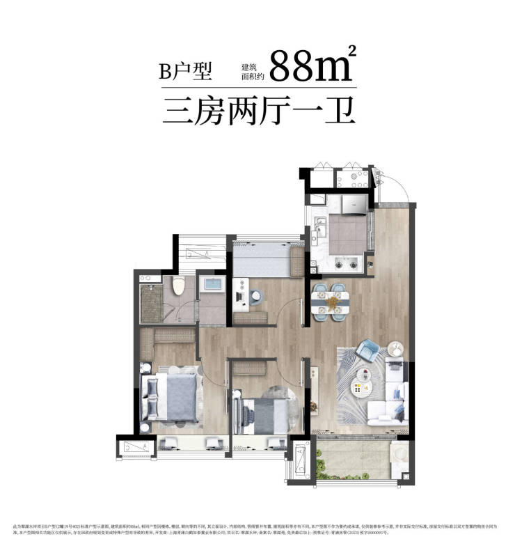 88㎡三房一卫:空间利用率高,适合三口之家