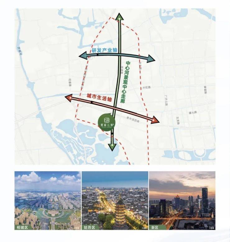项目位于相城、姑苏、新区三区交汇处——虎丘湿地公园北黄桥板块,占据“三心两轴一廊规划”的重要区位,是自然资源、城市规划、产业布局正在全新融合的一个板块。