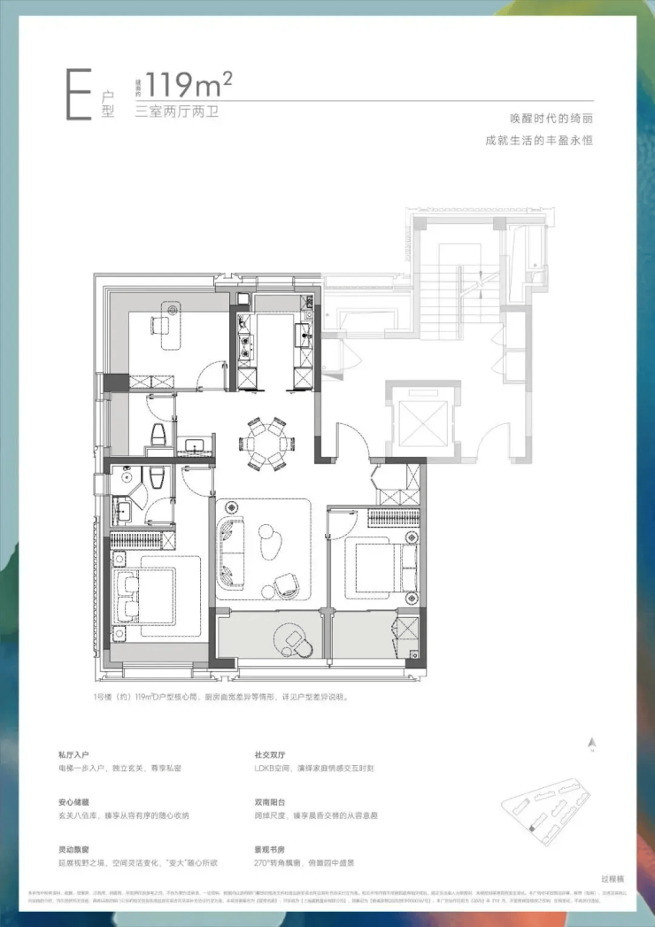 119㎡“舒居改善”户型:经典“飞机格局”,南北通透,通过优化3㎡过道提升近3%使用率,实得面积显著高于市场同面积段产品。