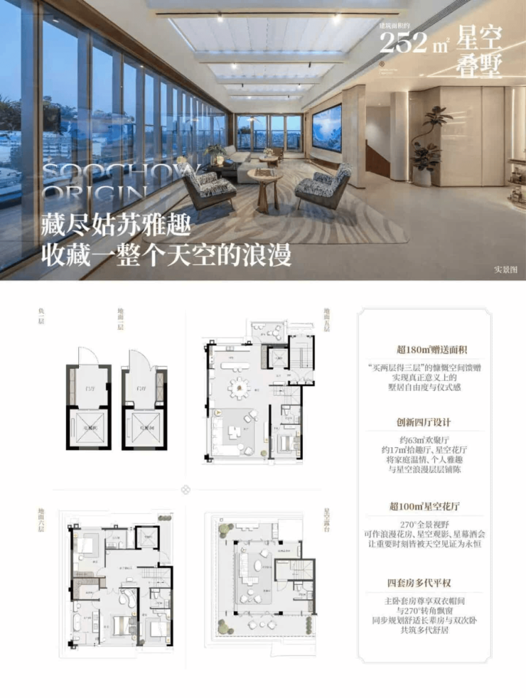 产品类型:建面约210-255㎡低密叠墅,建面约150-180㎡臻境洋房