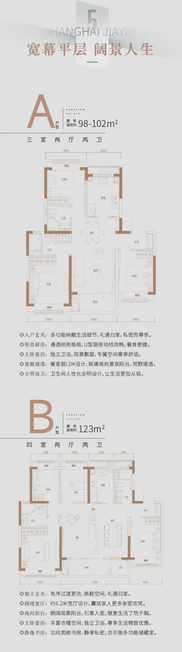 98-102㎡三房两卫:7.2米南向面宽,U型厨房操作台长4.8米