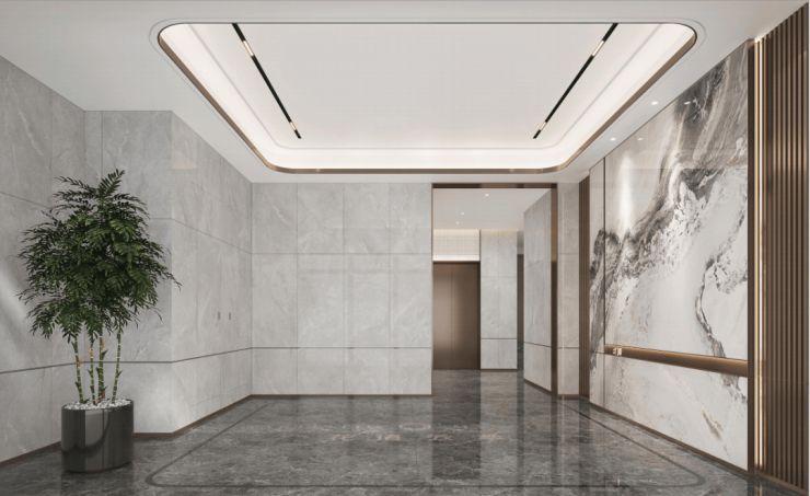 地上入户大堂,步入瞬间能感受到艺术级审美。岩板背景墙搭配灰色系地面,兼具品质感与美观性。