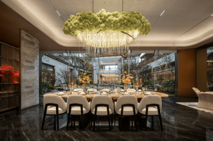 社区内部打造“一轴两园十景”园林体系,以西湖郭庄为蓝本,复刻曲径通幽、水榭亭台的东方意境,2700㎡下沉式“琉璃会馆”为全社区共享。