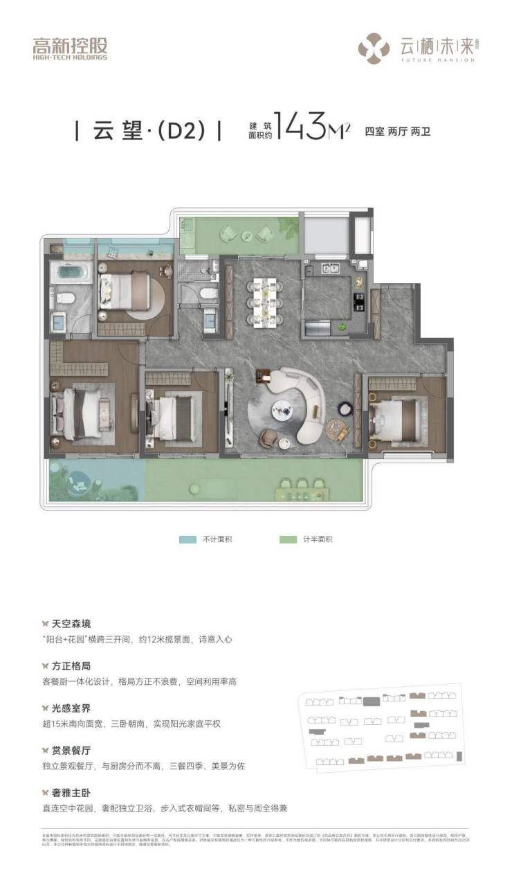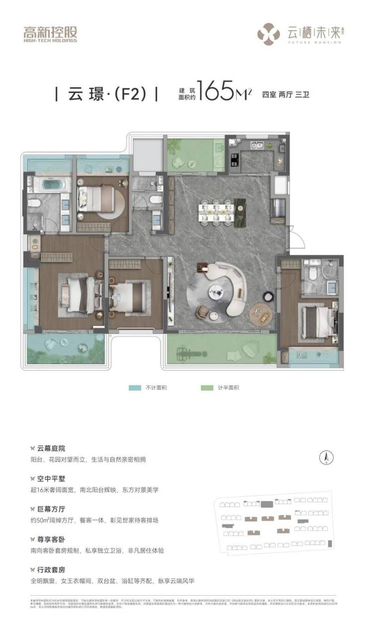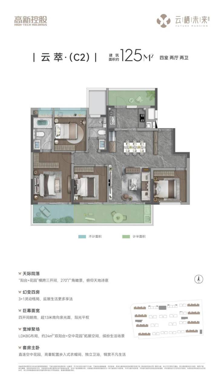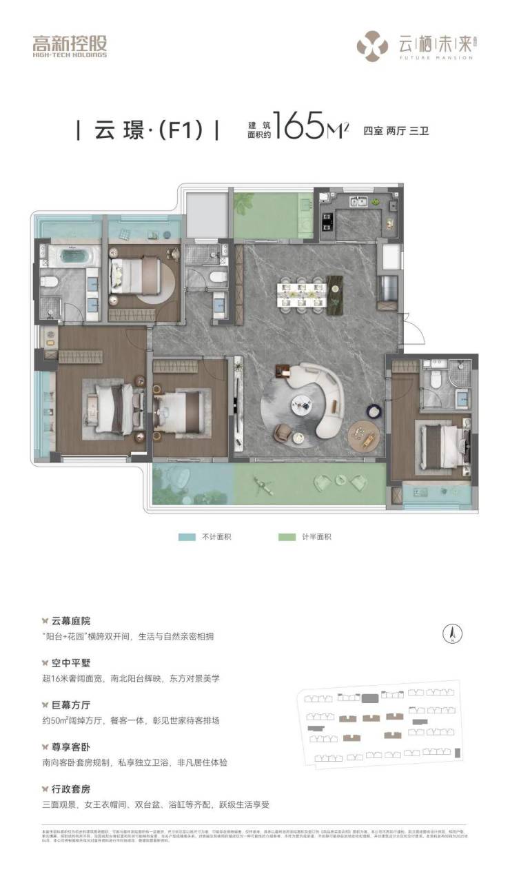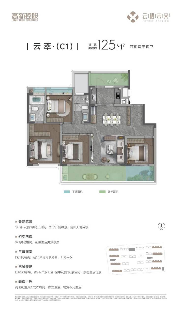 高实得率 改善精装四房主城难得约125-165㎡全四房改善洋房,以洋房高得房率为基底,叠享空中花园+飘窗(全赠送)、南北双阳台(半赠送)等多维不计容空间,以最高超100%有效空间增值,重新定义改善型居住标准。
