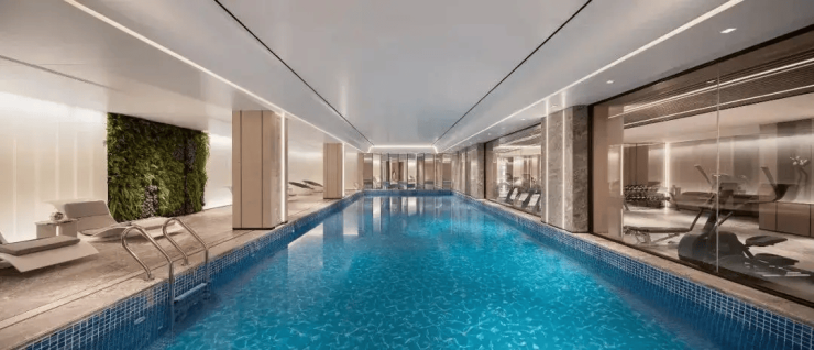 社区园林:由日清设计打造“水浪纹艺术小品+叠水台阶+镜面水景”,营造“隐逸江河汇”的静谧氛围。