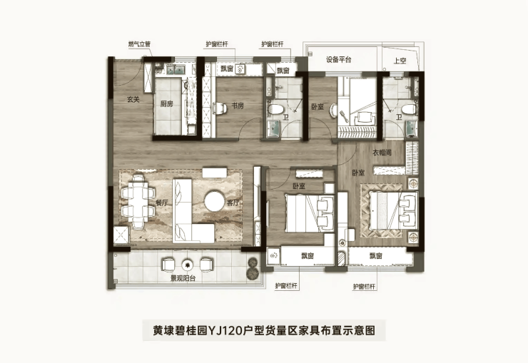 120㎡四居:入户玄关设计,约6.2m宽景阳台,南向双飘窗,得房率81%;