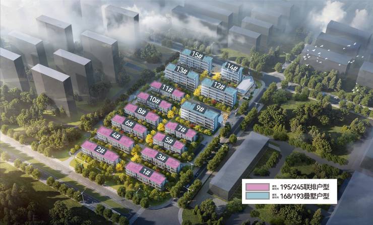 项目规划14栋3-6F住宅,包括9栋联排别墅(3F)和5栋叠墅(6F),共102户。户型面积方面: