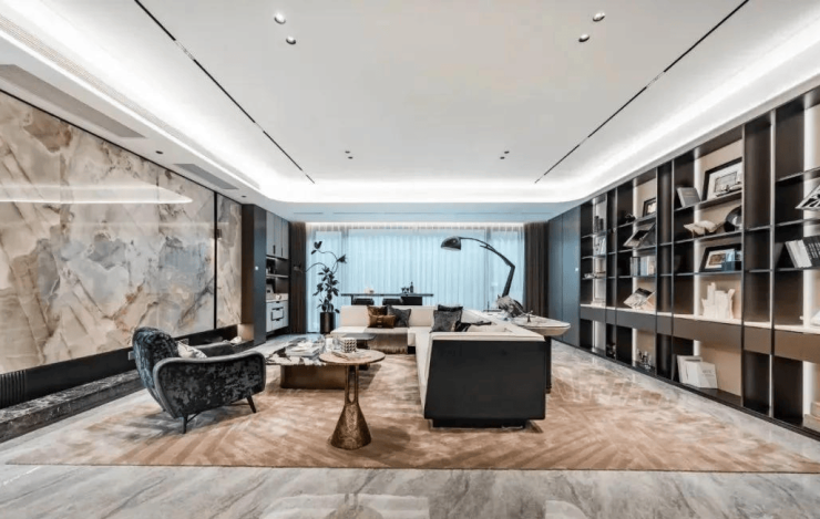 LDKB一体化超大宽厅,简一地砖通铺,顶部弧形吊顶,岩板背景墙交付,