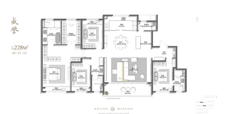 建面约228㎡洋房南向总面宽约21米,约7.1米阳台,做到双套房、双衣帽间、双玄关、主卧双开门、中西双厨五双户型,且双套房布局做到全明三卫。