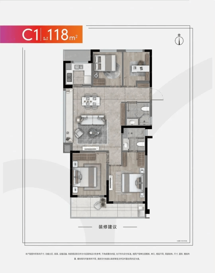 建面约118㎡:4室2厅2卫,空间宽敞,满足改善型家庭需求。