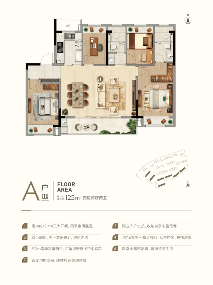 户型设计:主力户型为建面约 125㎡、139㎡及 165㎡的四房设计。采用“大横厅、大开间”布局,南向面宽最大可达 13.4 米,得房率高达 85% 左右,空间利用率在同类产品中优势明显。