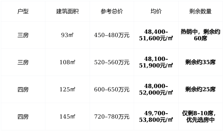 🏠 在售情况:93㎡三房热销中,145㎡四房仅余不足10席,总价450万起