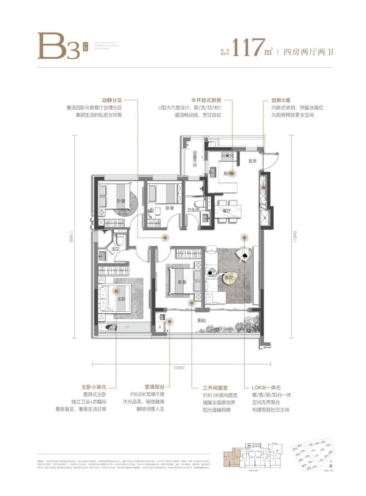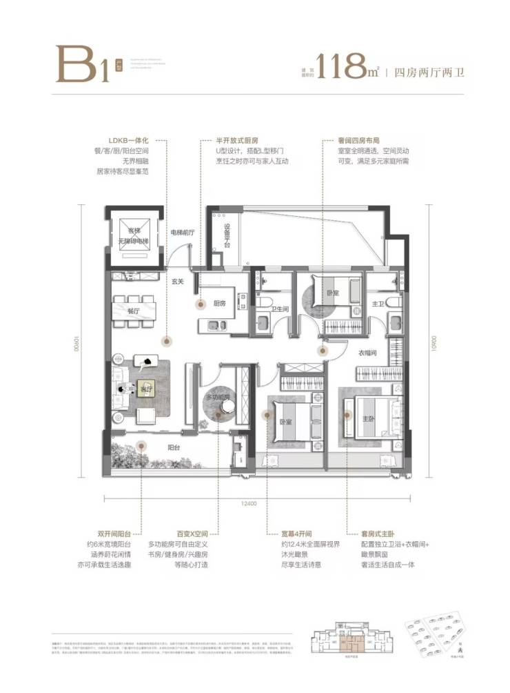 所有户型均采用LDKB一体化设计(客厅、餐厅、厨房、阳台一体化),打通空间边界,半开放式厨房既兼顾了互动性又不失实用性,宽境阳台延伸了生活视野,主卧的套房式设计则为居住者提供了私密和尊崇感