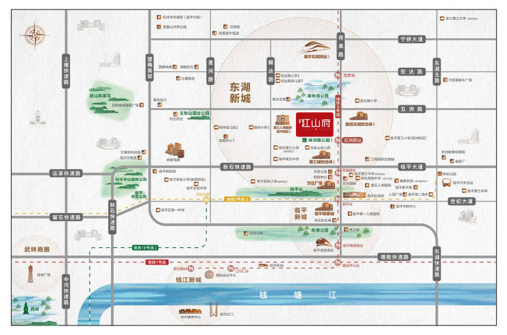 地面交通同样便捷:邻近秋石高架、东湖高架入口仅700米,快速辐射全城;更毗邻规划中的临平北站高铁枢纽,未来借沪乍杭高铁融入长三角"1小时生活圈"