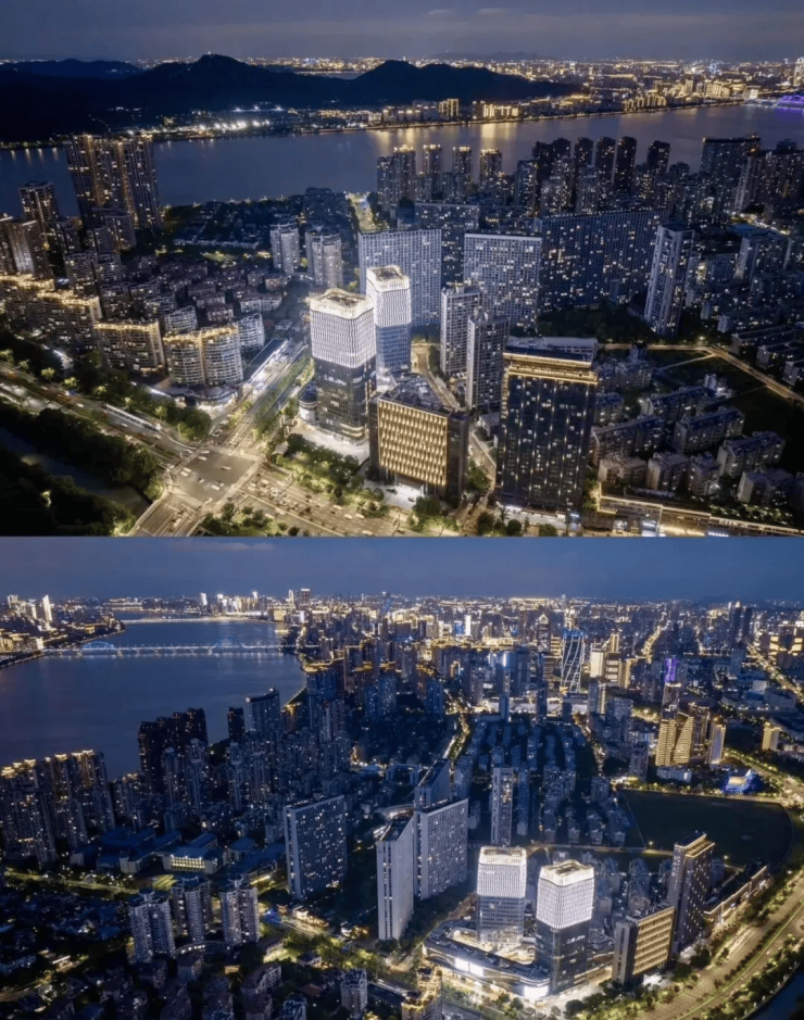 建筑特色:双曲塔冠造型灵感源自西湖群山,外立面采用蓝灰色中空Low-E玻璃+浅灰色铝板,光影流动间与江岸同频呼吸