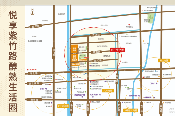 临近城北商圈,紫竹路沿街商业成熟,购物、餐饮、银行(浦发、建行、昆山农商行)、邮政等配套齐全,生活便利性高