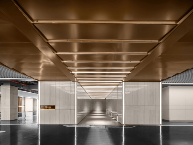 车库内部,地面采用了环氧地坪+金刚砂,部分主车道顶部是铝格栅+灯带的设计,有种一路指引归家的感觉。