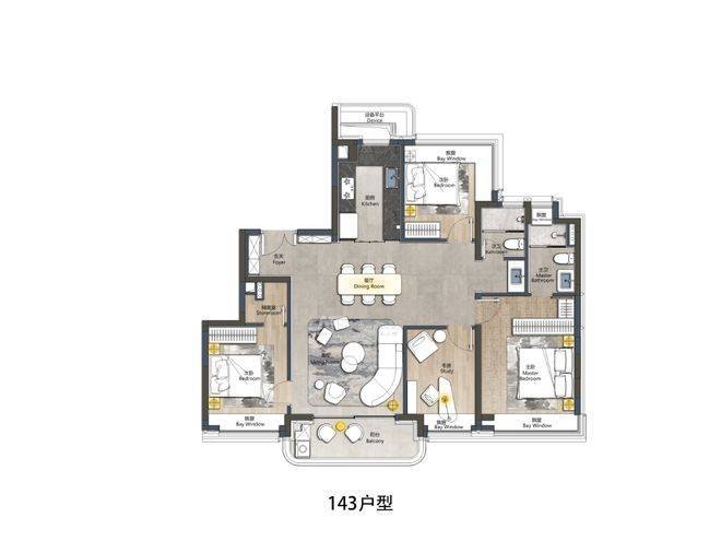143㎡四房:飞机户型设计,四开间朝南,南向面宽约13.5米;主卧套间设计,配备独立衣帽间及270°转角飘窗;客厅书房可打通形成约6米面宽的大横厅。