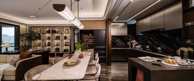 厨房系统:博世灶具、油烟机、蒸烤一体机、洗碗机四件套,搭配西门子双开门冰箱;橱柜采用金属色泽柜体,提升空间质感。