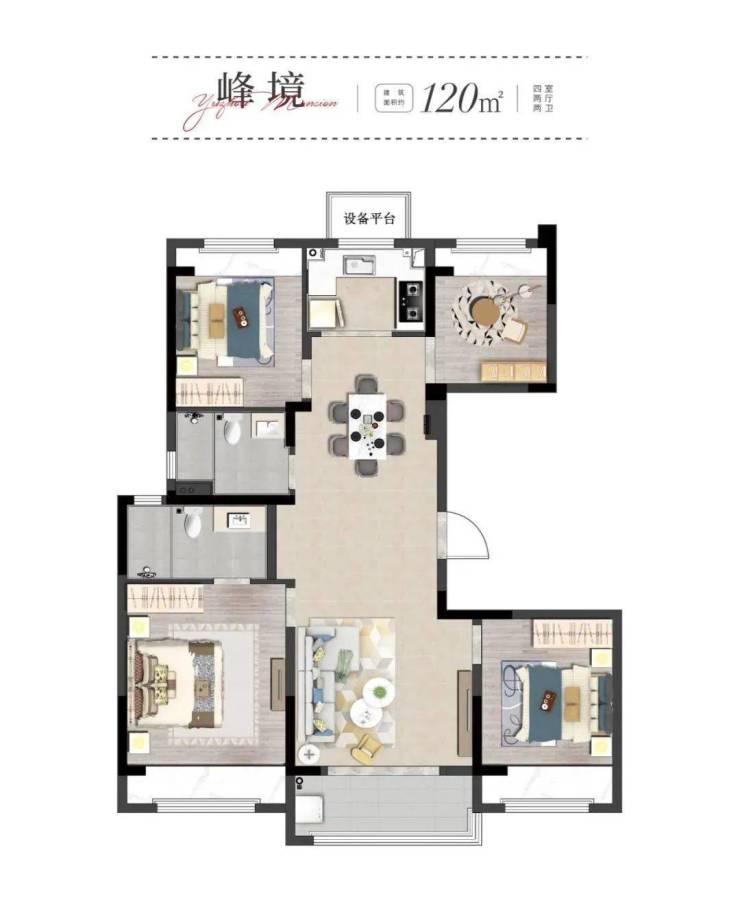 建筑面积约140㎡雅境户型,四室两厅两卫,采取了双台盆设计,好的人居住宅作品,卫生间不仅该注重美观,实用性也是相当重要。