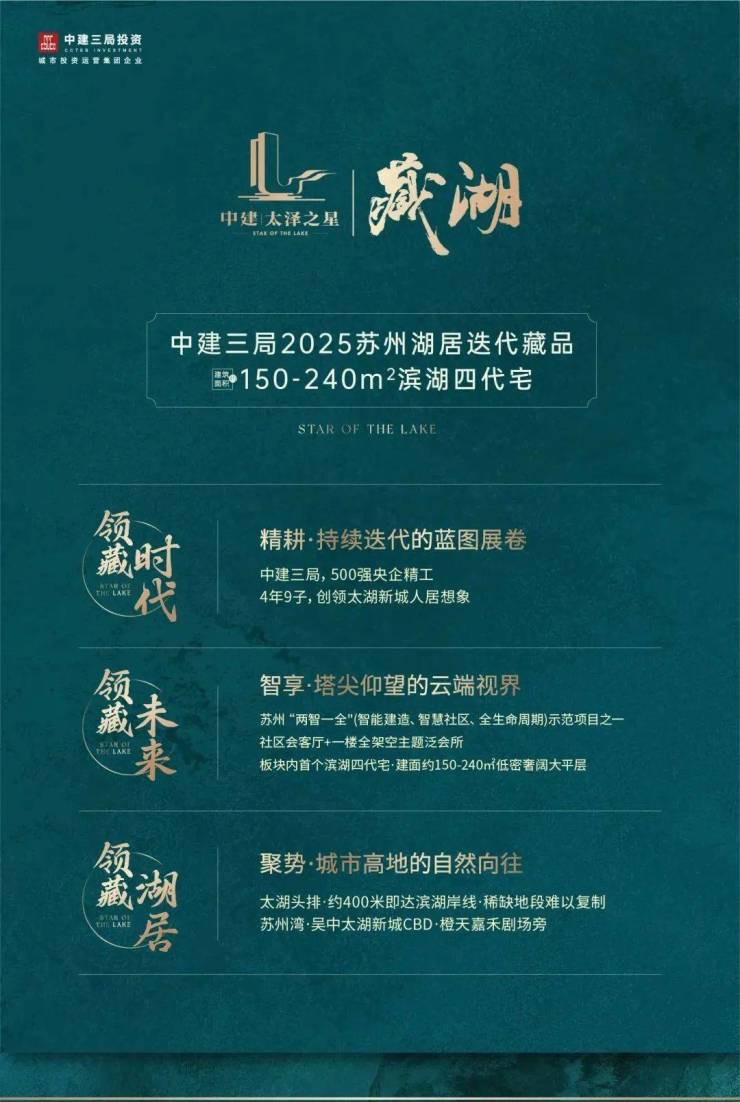 4月23日,2025年中建三局苏州湾新作品【苏地2023-WG-2号地块】,案名面向全球首次发布——【中建·太泽之星 | 藏湖】,作为苏州湖居的迭代珍藏之作,为太湖谱写全新的人居篇章!