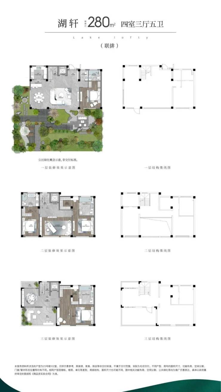 (1)联排:打造约246m²、约256m²(边户)、约280m²三个户型面积,以迭代的联排作品,致敬真别墅的回归