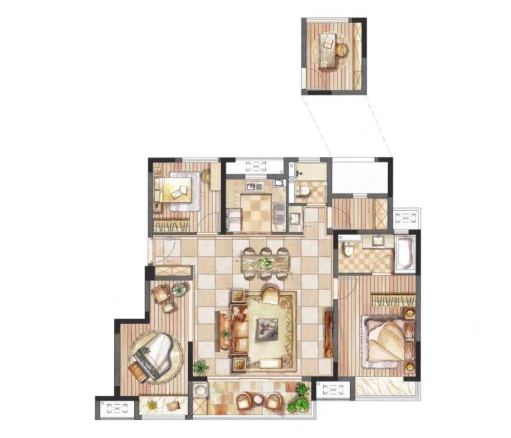 洋房户型:120㎡四叶草布局,三开间两卧朝南,主卧套房设计