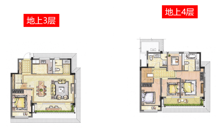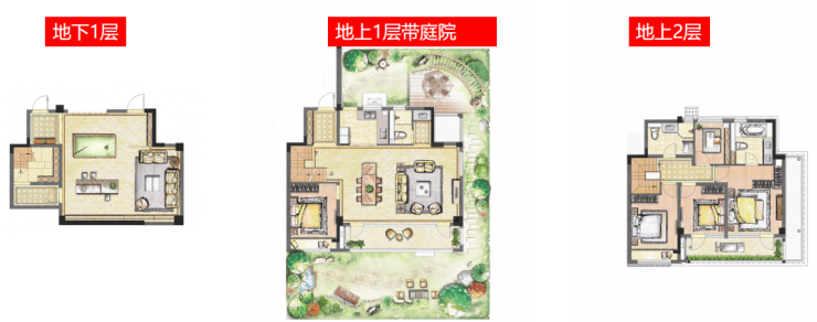 叠加户型:169-253㎡产品均带庭院,下叠含地下一层+地上两层,上叠设270°环檐露台