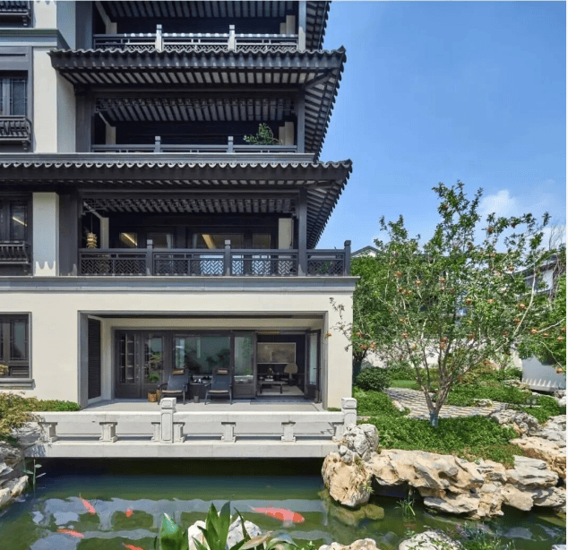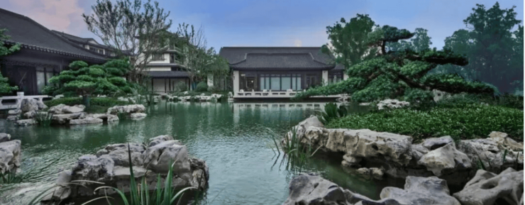 开发商常熟服装城集团资产总额61亿,年交易额超1600亿元,项目采用粉墙黛瓦的中式立面,多层飞檐设计彰显江南特色