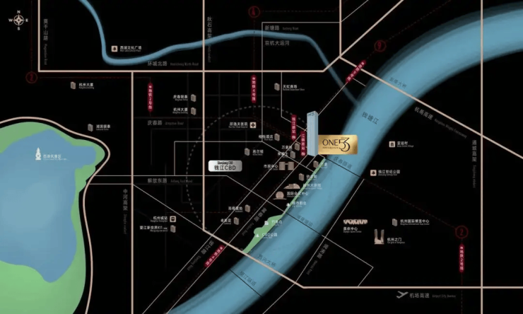跨江动脉:经庆春隧道、博奥隧道、望江隧道,10分钟直达钱江新城CBD,15分钟抵达杭州东站,20分钟抵达萧山国际机场。