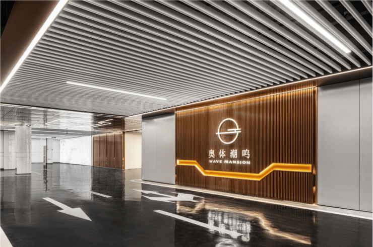 车库内部,地面采用了环氧地坪+金刚砂,部分主车道顶部是铝格栅+灯带的设计,有种一路指引归家的感觉。