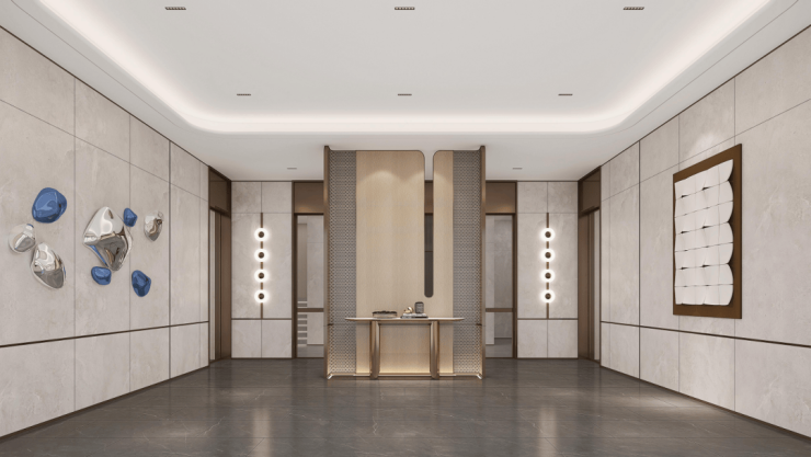 坡道玄关铺设了星空顶,奥体潮鸣logo,配以定制的潮涌水波纹,专属于奥体潮鸣业主的归家仪式感立马就上来了。
