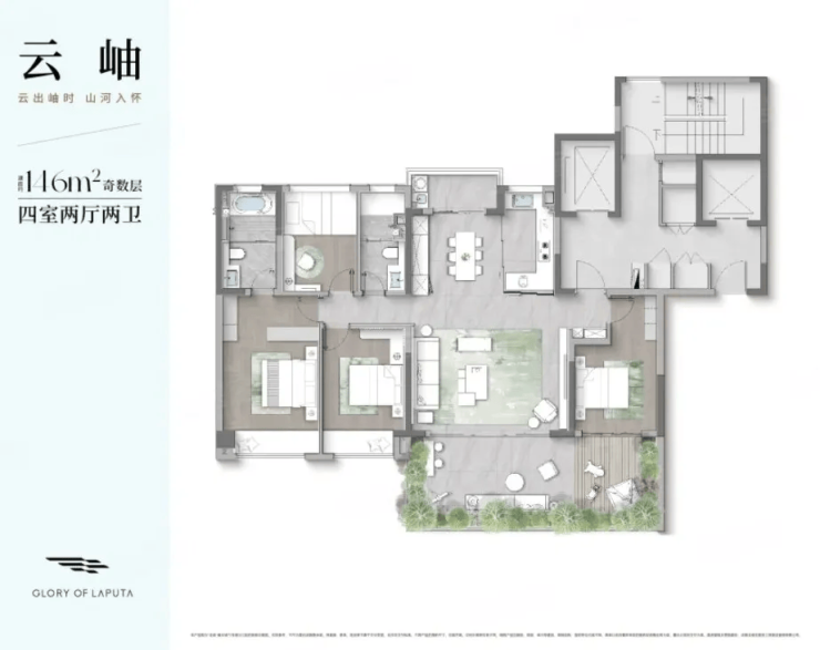 生态云:约5万方立体江南园林,融入苏绣、黛瓦等文化元素,搭配西班牙珊瑚红等奢石及百年古树,营造诗意栖居氛围。