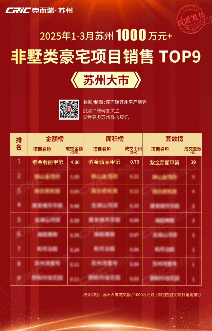 2025年一季度,紫金翡丽甲第以4.8亿元、0.79万㎡、39套备案成绩,高居苏州千万级非墅豪宅项目销售三榜TOP1,成为名副其实的"三冠王"。入市7个月以来,项目始终保持全维度领先,3月备案成绩更是第二名的2倍以上。