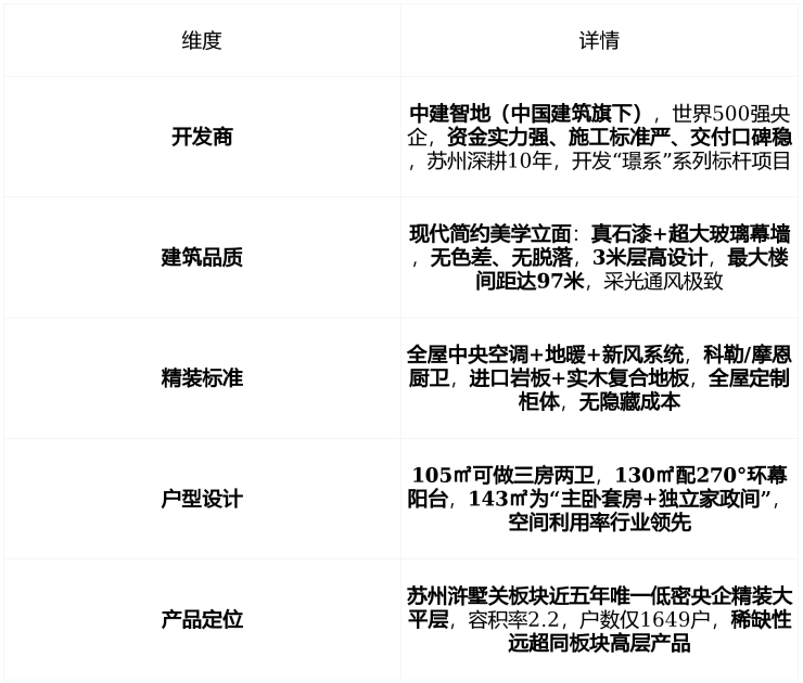 核心优势中建智地央企开发 + 容积率2.2低密社区 + 37%高绿化率 + 苏州唯一社区巴士直达宜家/Costco/狮山CBD + 专属“璟会所”+双实景示范区 ,苏州北区稀缺“轻奢生活圈”标杆。