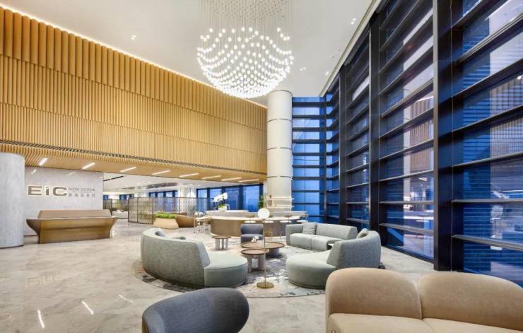 EIC在标准层高约4.5米、局部挑高约9米的大开间格局里,精心规划品牌区、访谈区、会议区、生活娱乐区、互动社交区、科技创新区。项目注重ESG理念,采用石材、陶土、木饰等可回收材料,创新2.4米宽杭州罕见玻璃幕墙,还提前构建了万兆光纤、燃气管道以及有淋浴、洗漱功能的VIP卫生间,员工在工作中生活,在生活中工作,让工作充满社交与互动,高效且怡人。