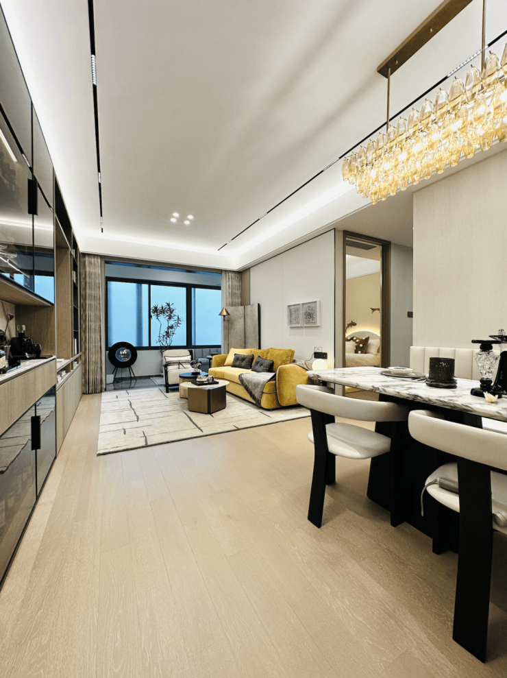 两款户型均为精装交付,甄选科勒、西门子等国内外一线家装品牌,配备中央空调、地暖、新风系统"三大件"。得房率约75%,装修标准较高,性价比突出。