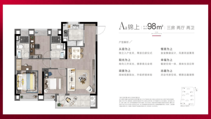 98㎡户型 :南北通透,主卧套房设计,配备独立卫浴与步入式衣帽间,总价约351万起