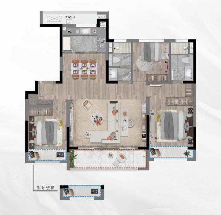 洋房:97-118㎡三居室,户型方正,三开间朝南,全明格局