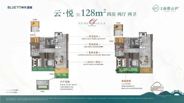 126㎡四房两厅两卫:空间方正通透,四室布局适配二孩家庭,部分户型配备270°空中转角露台,拓展生活场景;