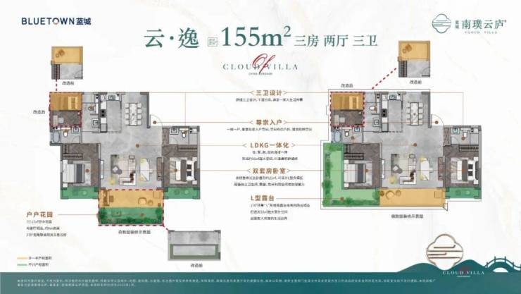 155㎡三房两厅三卫:主打宽奢尺度,主卧配备独立衣帽间与卫浴,适合追求居住品质的改善群体;